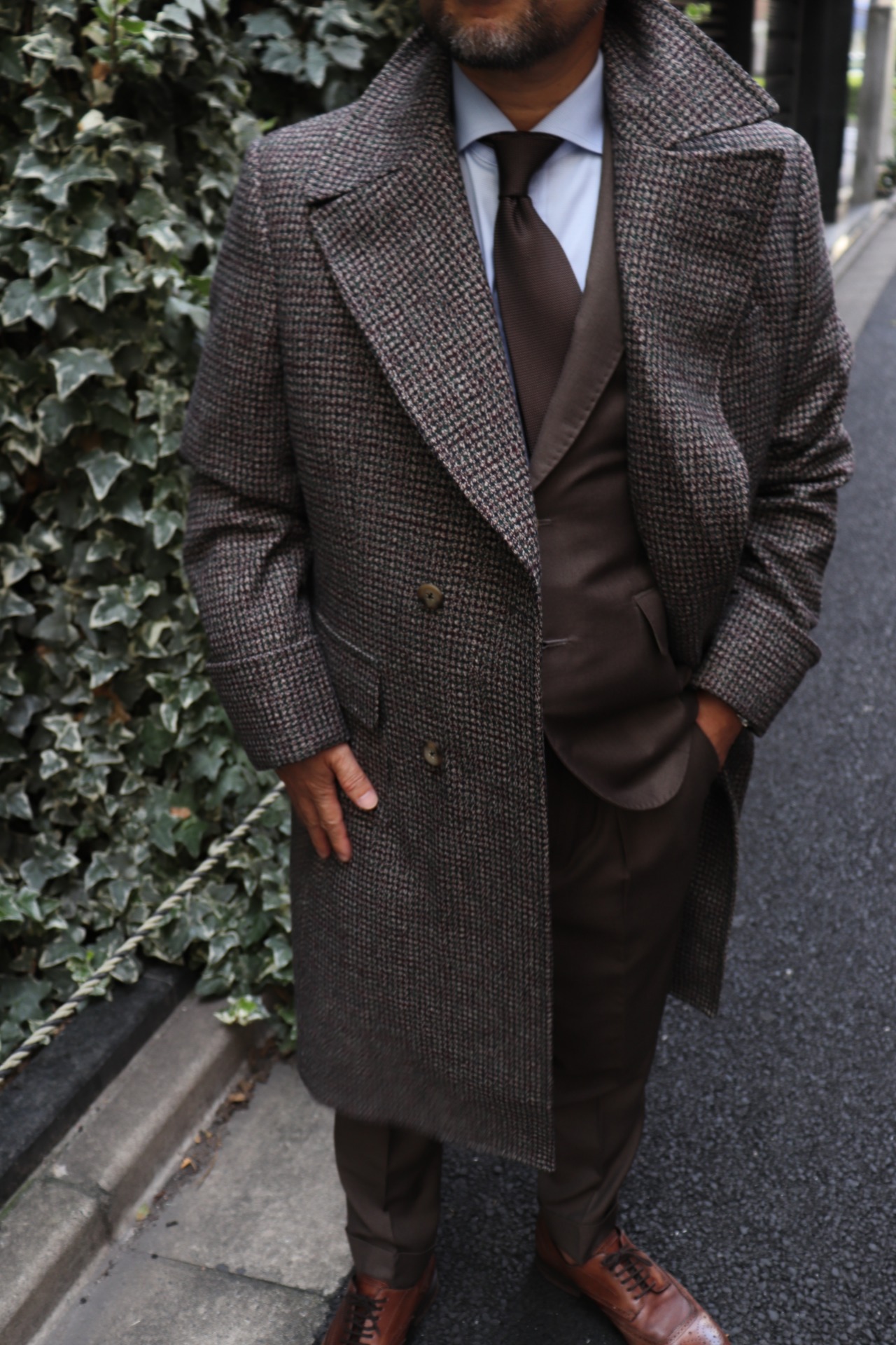 秋を感じる茶のスーツ