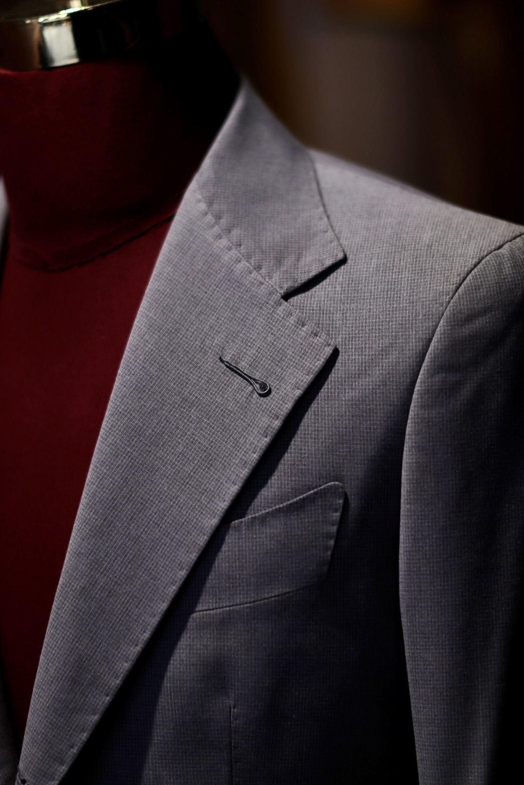 MICHELE&shinのスーツはイタリアナポリ職人が作るハンドメイド。イタリア職人が作るハンドメイドスーツの大きな特徴がこの立体感。このライトグレーのスーツはより写真でその立体感が伝わるのではないでしょうか。