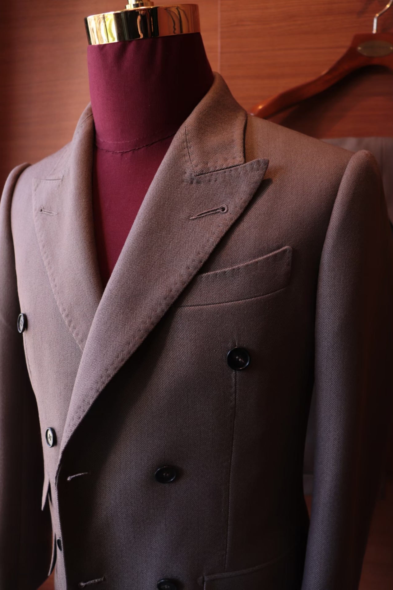 リオンのクリエイターロメインデザインのグレージュヘリンボーンダブルスーツ