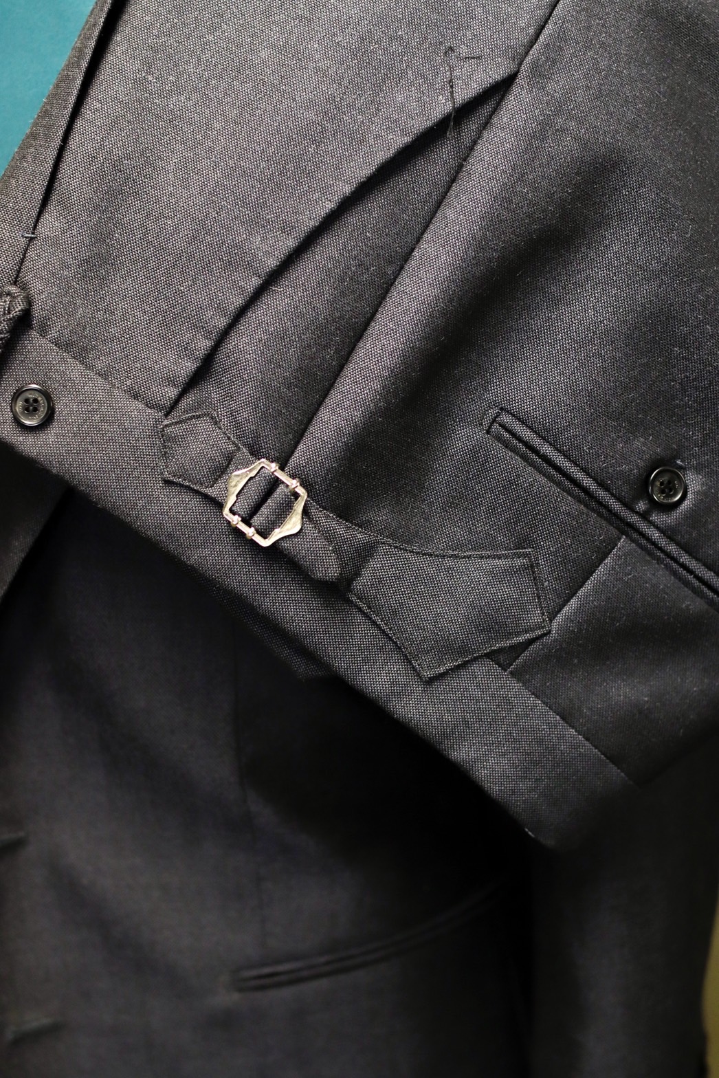 パンツはアウトワンタックでピストル型のサイドアジャスター。ウエスマンは3.5cmでデザインしました。