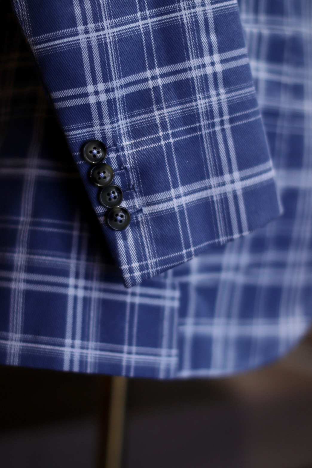 この生地は、4~5年ぐらい前だと思います、イタリア、プラートの布生地屋で出会ったのがきっかけでした。いつもの様に宝探しの様に布生地を探してたところ、高い棚の端からちょこっとこの布生地が見えました。「良い感じの布生地があるねー。」と無理を言って、高い棚の隠れてたのを引っ張り出して貰ったのですが出して見ると2mしかない事が分かるし、よく見ると固い固いデニム生地・・・・ヤバい・・・。クリスティアーノを見あげると、彫りの深い顔で「隠れてたのを無理して出したんだから買うよなー」的な圧力がかかります。しかし2mしかなくてこの厚みだと厳しいなーと思い、再度クリスティアーノを見上げると、さらに彫りが深くなってます。 「買います、いや買わせて下さい。汗」