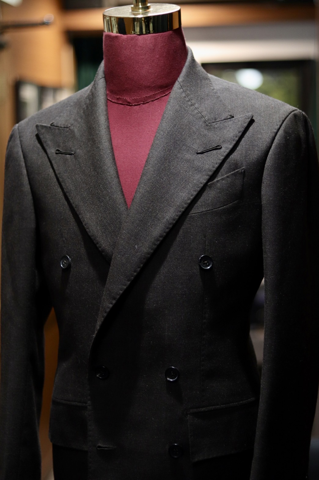 ウイリアムハルステッドのCHURCHILL(チャーチル)390gm wool100 を使ったダブルブレストのジャケットです。男を魅力的見せるブラウンのダブルブレストが本当に美しい仕上がりです。ウイリアムハルステッドのイギリス生地独特のあの、しっかりとした張りと厚みのある生地がイタリア製フルオーダージャケットの手縫いの柔らかさと相まって、シャープでありながらも、イタリア独特の丸みがあるのが写真で分かってもらえると思います。