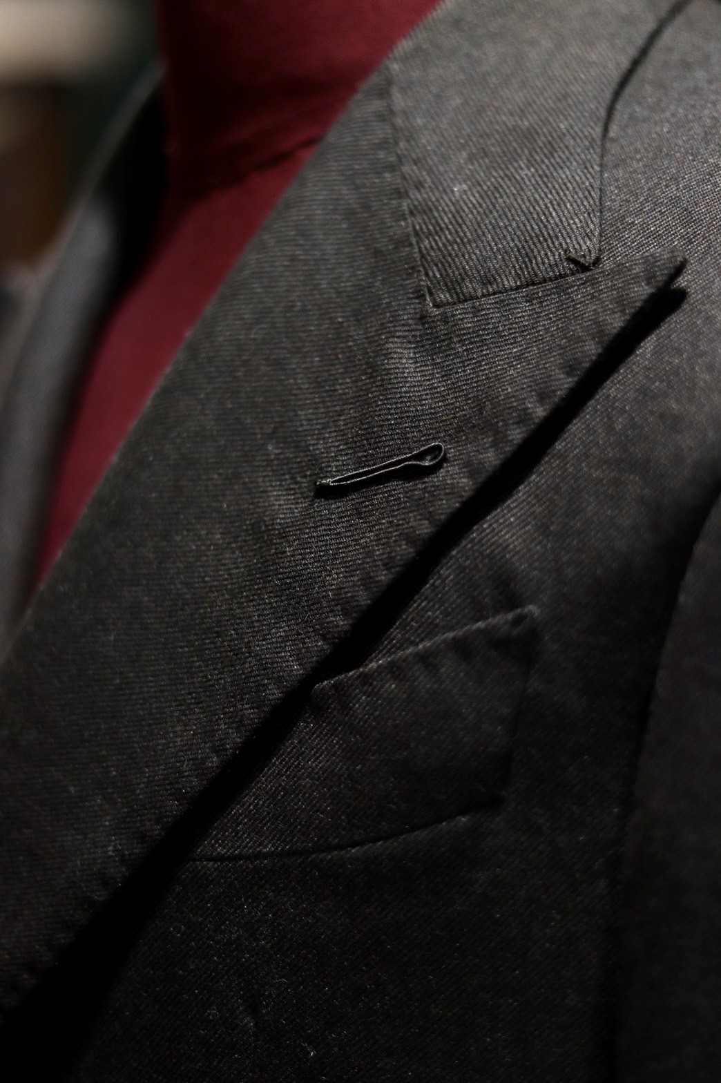 ミラネーゼスタイルの手縫いのフラワーホールです。ナポリジャケットなら必須のポイントでオーダーメイドなら必ずやって欲しいデザインです。
