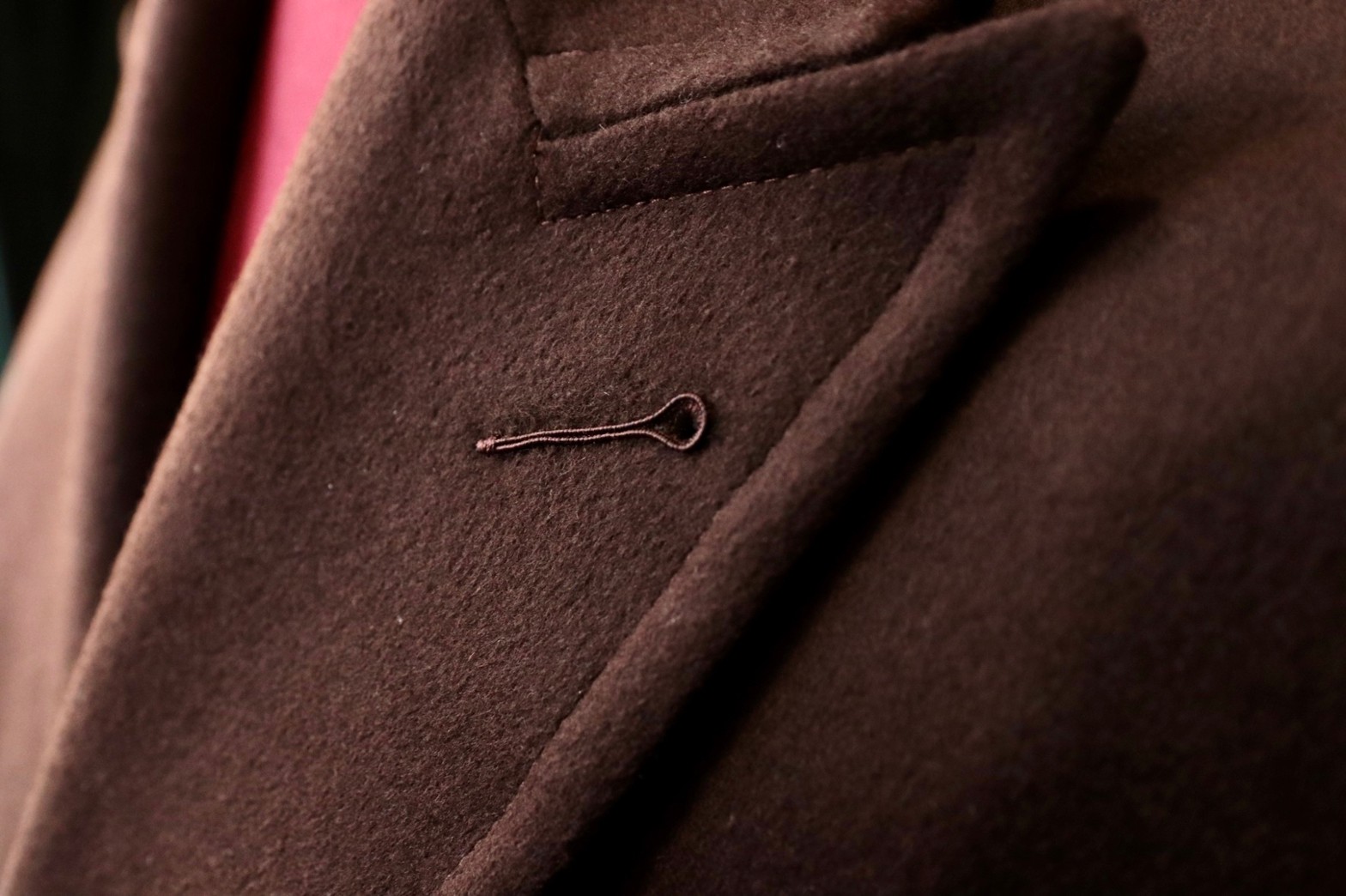ベーシックなダブルのチェスターフィールドコートですが、細かいディテールに今のイタリアが散りばめられています。