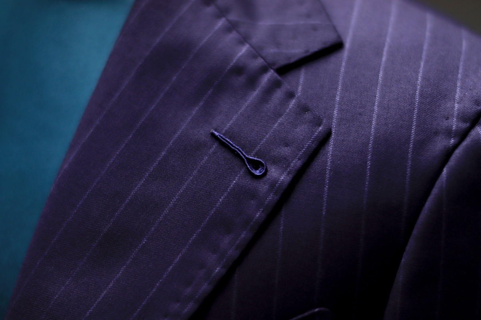 ストライプは本当に奥深い柄で多種多様な表情を見せます。凛とした表情を見せるペンシルストライプ、少しの冒険心をくすぐるチョークストライプ、 繊細さを伝えるヘアストライプ、大胆なストライプで見る者を楽しくさせるロンドンストライプ、隠れたお洒落を演出してくれるシャドーストライプなど、多種多様な表情です。そんな豊かな表情を見せるストライプスーツの中でも今回完成したスーツは、チョークストライプとペンシルストライプのちょうど中間の様なストライプでパワースーツと言っても過言でないでしょう。チョークストライプだとビジネスにはチョットと感じる人に最高のストライプです。