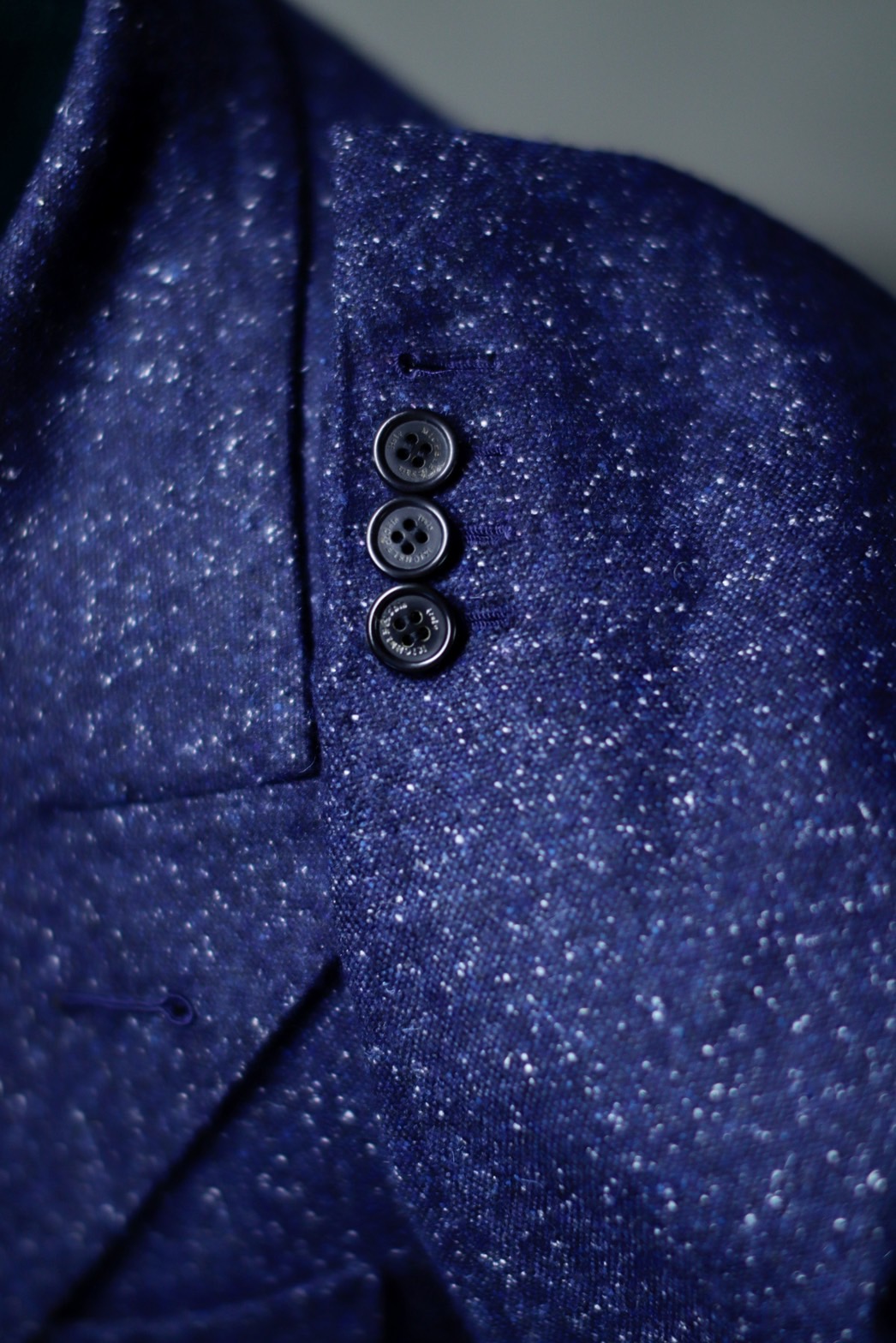 この布生地も良いでしょう?ネイビーブルーに霜降りぽい何とも言えない、MICHELE&shinオリジナルの布生地です。こんな布生地見た事無いでしょう?厚み表情、柄、全てが美しいのです。やっぱりイタリアの布生地は一つ抜けてる感じがします。