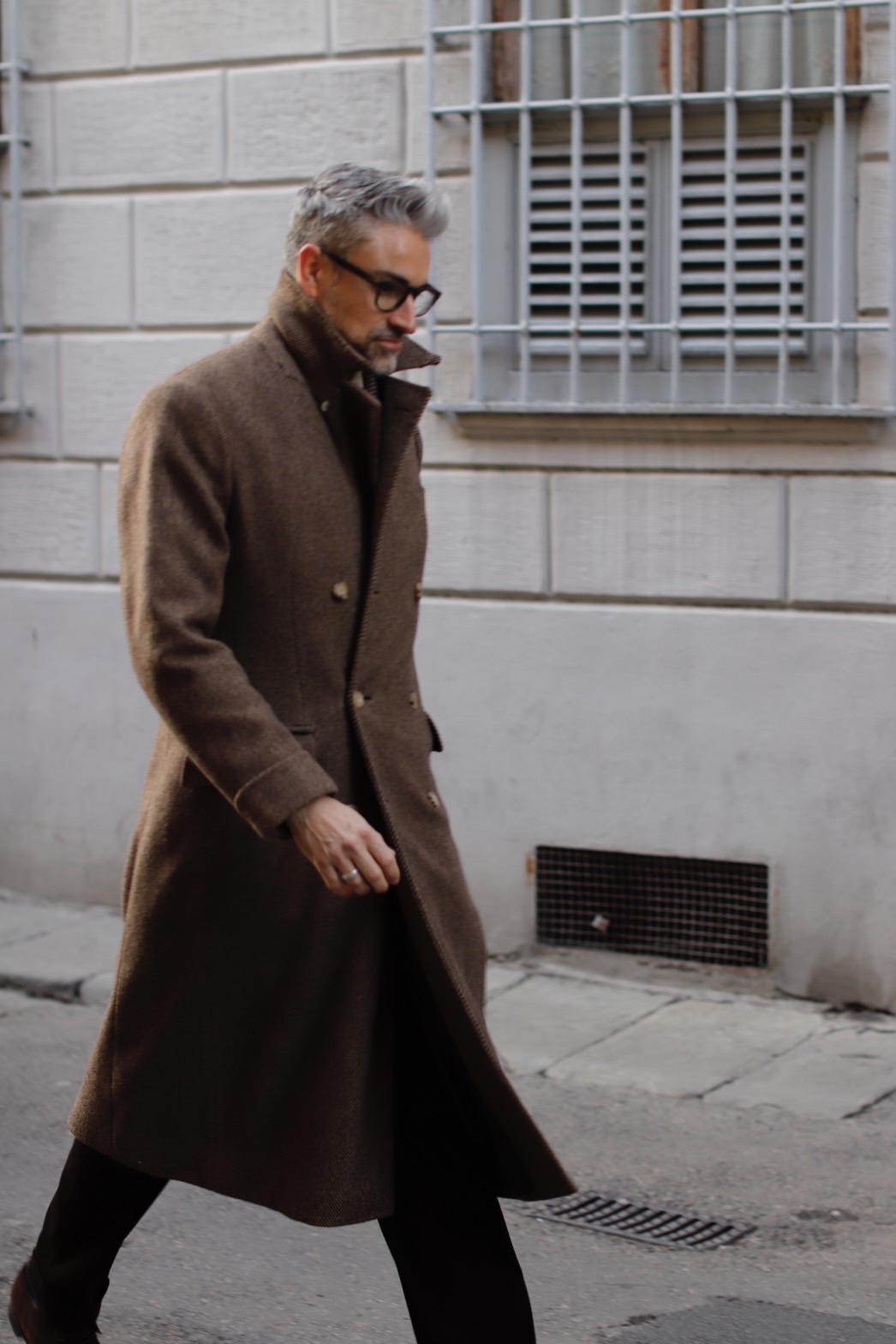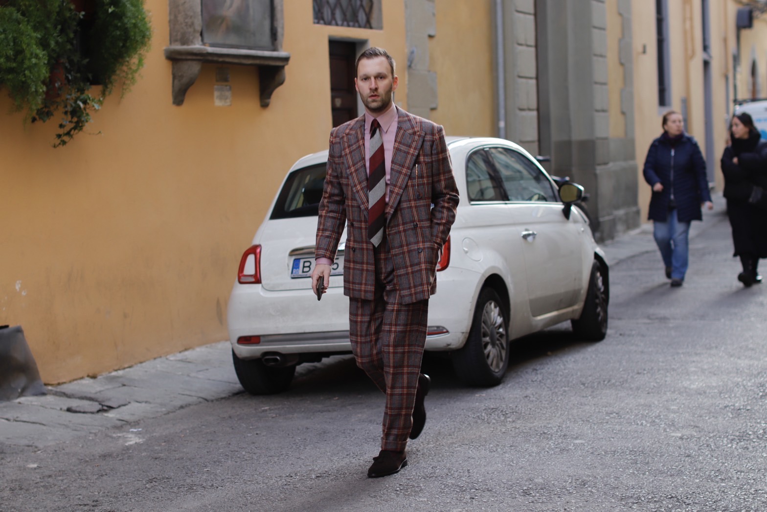 今回はフィレンツェの灰色の石畳と歴史ある建物に美しく映える、「茶」を着こなしてる紳士のスナップです。