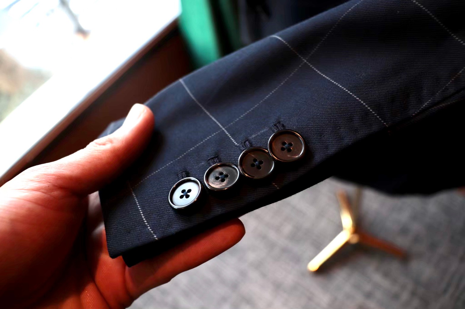 気づいた人もいるとは思いますが、あえてダブル6釦1掛の段返りデザインにしています。これは去年のPITTIUOMOで会ったサルトリアのおやじがやっていて、かっこいいと思ったのでデザインを参考にして作りました。